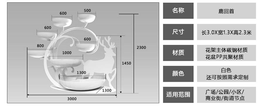 【規(guī) 格】3000mm×1300mm×2300mm;【材 質(zhì)】花盆:PP共聚材質(zhì) 花架: 碳鋼噴塑;