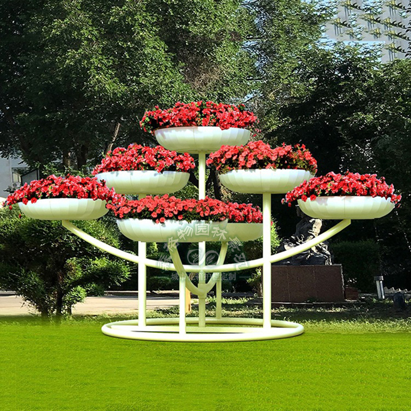 常規(guī)的立體花架,是由架體,花籃等構(gòu)成,其特征是架體是由豎桿、花架上桿、固定套管、花架地腳構(gòu)成,在架體的上部固連有掛鉤,其上掛有與標(biāo)示牌相連的掛鏈;架體的中部鉸接有數(shù)個(gè)C形框,花籃置與呈上、下排列的花籃框中,花籃框的邊緣設(shè)有框形掛鉤,與鉸接在豎桿上的C形框相連,架體下部設(shè)有加固平衡架。立體花架有哪些部分組成