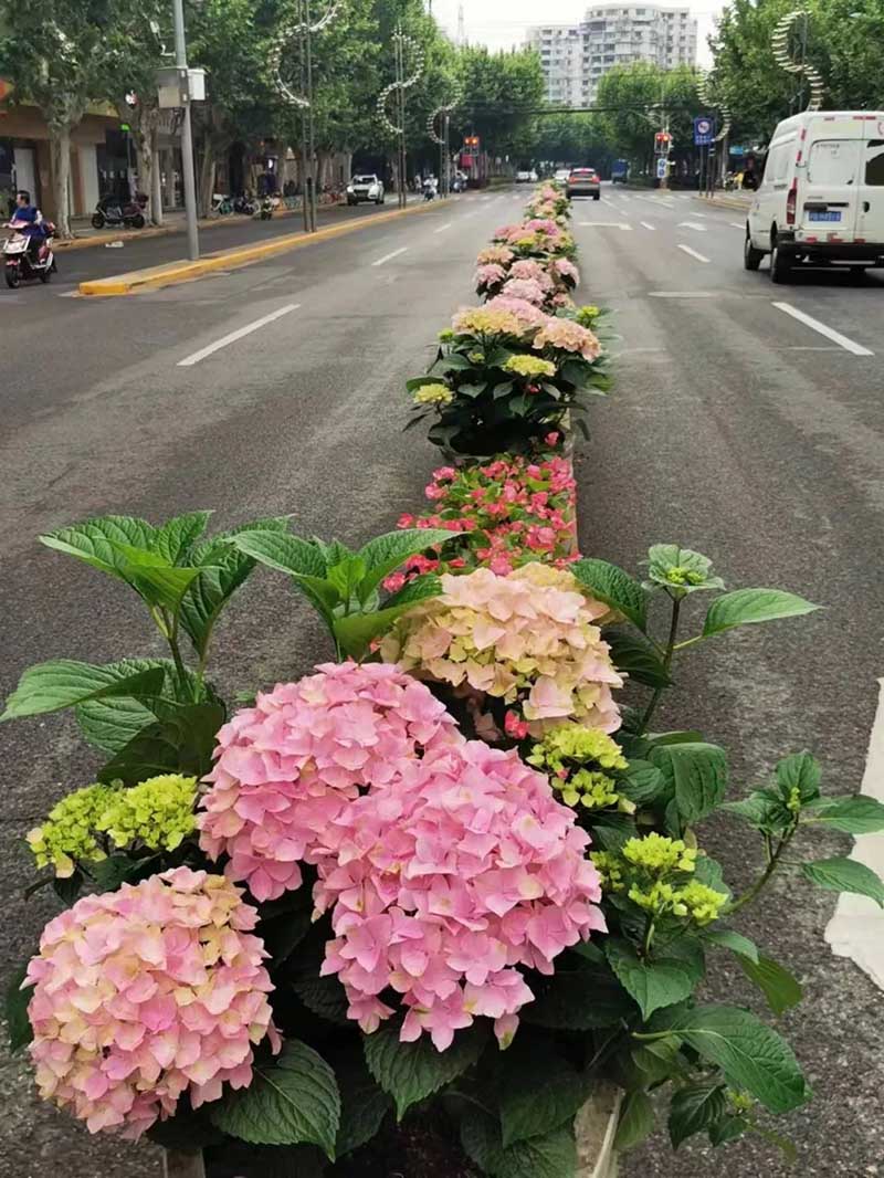 志丹路花箱:志丹路上明媚的八仙花配上艷麗的紅色海棠,帶來(lái)初夏的清新和自然。